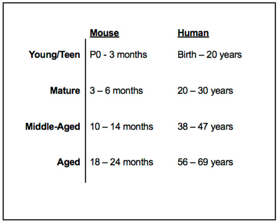 - Flurkey, K.; Currer, J.M.; Harrison, D.E. Mouse Models in Aging Research. In The Mouse in Biomedical Research; Academic Press: Cambridge, MA, USA, 2007; pp. 637–672. ISBN 9780123694546. [Google Scholar]