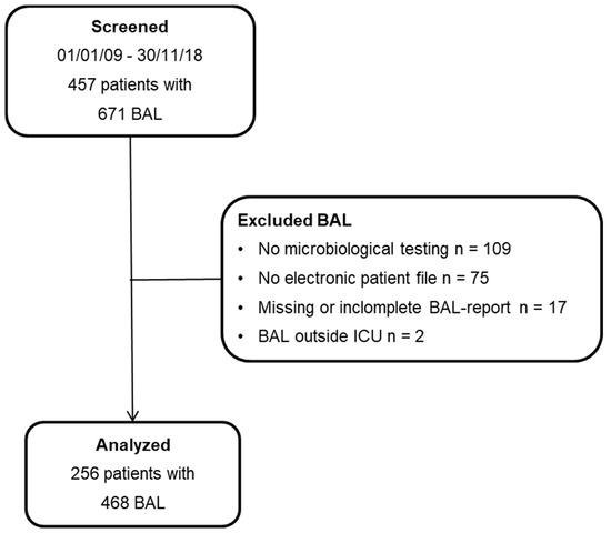 Data collection: A computerized search using the German Procedure Classification/OPS code for bronchoalveolar lavage 1-620.0, 1-620.3 and 1-843 was conducted. By manual review, inclusion and exclusion criteria were verified. Specifically, patients without electronic patient files, cases in which BAL was not performed by a pulmonary specialist during the daytime, patients with incomplete reports and cases of BAL performed outside the ICU were excluded. Patient data were accessed and analyzed on a tabular listing using Microsoft Excel (version 2010, Microsoft, Redmond, WA, USA). All outcome variables were evaluated by a manual search of medical and patient records.