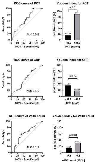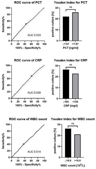 Immunocompromised subgroup: When evaluating the subgroup of immunocompromised patients, we found that the values for the area under the receiver operating curve for PCT, CRP and WBC counts were higher compared to that for the whole cohort (AUC 0.65, 0.57 and 0.61, respectively). The optimal cutoff values for discrimination according to the Youden index are presented in Figure 3.