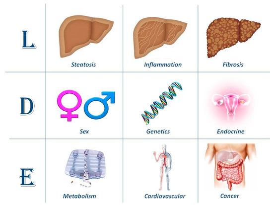 Finally, the suffix “E” stands for “extra-hepatic” manifestations of fatty liver syndromes, the most common of which are metabolic, cardiovascular and cancer, extensively reviewed elsewhere by this group and others [94,95,96,97,98]. The extent and accuracy of the assessment which should be carried out in the individual patient to fully characterize the “E” section of the LDE system is best tailored based on careful evaluation of personal and family history.
