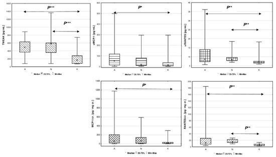 Comparison of estimated biomarkers between studied children with congenital A, acquired solitary functioning kidney N and the reference K groups. Figure legend: P* p < 0.05, P** p < 0.01, P*** p < 0.0001. (A) TWEAK [pg/mL]; (B) uMCP-1 [pg/mL]; (C) uRANTES [pg/mL]; (D) MCP-1/cr. [pg/mg cr.]; (E) RANTES/cr. [pg/mg cr.].