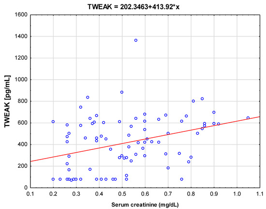 Further tests were carried out to identify correlations of estimated markers with parameters of renal function. As shown in Figure 2, in univariate analysis, serum TWEAK was positively correlated with serum creatinine (r = 0.356; p < 0.001).