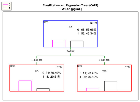 The analysis of CART classification trees showed that the most optimal cut-off point of patient differentiation is the TWEAK value of 395.628 pg/mL. Patients with serum TWEAK concentration above this value can be classified as impaired kidney function, because in the group with TWEAK > 395.628 pg/mL 77.60% of patients showed signs of renal impairment (albuminuria and/or decreased eGFR < 90 mL/min/1.73 m2 and/or hypertension). It should be noted that in both analyses the proposed cut-off point was similar.