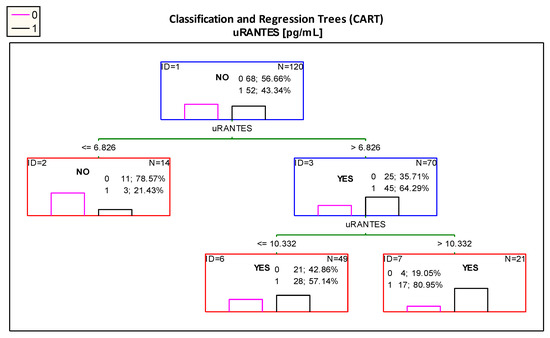 Importantly, according the ROC curve analysis the best cut-off value for uRANTES excretion was 10.734 pg/mL (Table 2B); in the analysis using the CART method, the proposed cut-off point is almost the same—10.332 pg/mL.