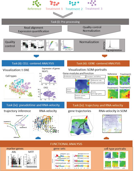 - Analysis of developmental trajectories in terms of pseudotime and RNA velocity aim at deducing time-dependent aspects of tissue development and cancer progression from cross-sectional scRNA-seq data. scRNA-seq experiments provide snapshot data, which resolves the molecular heterogeneity of cell cultures and tissues with single cell resolution under static conditions (see task (ii)). Given, that each cell is measured only once, one needs computational methods to deduce developmental trajectories on cellular level from time-independent data. The pseudotime model assumes that single-cell transcriptomes can be understood as a series of microscopic states of cellular development that exist in parallel at the same (real) time in the cell culture or tissue under study. Moreover, the model assumes that the temporal development smoothly and continuously changes transcriptional states in small and densely distributed steps so that the similarity of transcriptional characteristics can serve as a proxy of time, called pseudotime. It scales development in units of values between zero and unities for the start and end points, respectively. The pseudotime algorithm typically aligns the cells along a trajectory in reduced multi-dimensional space where a large variety of projection algorithms can be applied, differing regarding criteria such as cellular ordering, topology, scalability and usability [66]. Each method has its own characteristics in terms of the underlying algorithm, produced outputs and regarding the topology of the pseudotime trajectory (e.g., predefined linear, multibranched, cyclic, or ‘inferred from the data’). ‘RNA-velocity’ provides another independent approach to infer developmental trajectories from static scRNA-seq data [67,68]. It directly ‘forecasts’ the transcriptional state of a cell based on the relation between spliced and unspliced mRNA in terms of a directional change of cell state in cell-diversity space (task (v)). RNA-velocity provides a vector-field reflecting transcriptional changes of each cell, which can be transferred into developmental trajectories joining sources and sinks of mRNA abundance in cell-state and gene-state space.