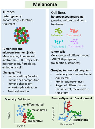 scRNA-seq has been applied in a significant number of studies on malignant melanoma (Table 1; Figure 2). The first major scRNA-seq study analyzing melanoma tissues investigated 19 samples of primary melanomas and metastatic lesions [80]. A significant inter-tumor heterogeneity was observed for melanoma cells in these tissues, while the immune cells in these analyses showed a relative homogeneous gene expression pattern [80]. Major subgroups of transcriptional heterogeneity were associated with cell cycle, spatial context of cells, and a drug-resistance program (MITF-low/AXL-high signature). Authors used single-cell signatures of T cell, B cells, fibroblasts, macrophages, and endothelial cells derived from this study and mapped them onto gene patterns of bulk sequences of 471 melanoma samples present in the Cancer Genome Atlas (TCGA). They then searched for genes expressed by cells of one type that may influence or reflect the proportion of cells of a different cell type in the tumor. By this means they showed that the abundance of cancer-associated fibroblasts (CAF) is predictive of the phenotype, and that fibroblast signatures influence the presence of specific immune cell signatures. Moreover, they identified single cells with an AXL-high/MITF-low signature in an AXL-low/MITF-high population, which would have been missed in bulk sequencing and may give rise to treatment resistance. The AXL/MITF dichotomy has been supported by a later study re-analyzing these data by a new software called Cyclum to identify latent periodic developmental processes [81].
