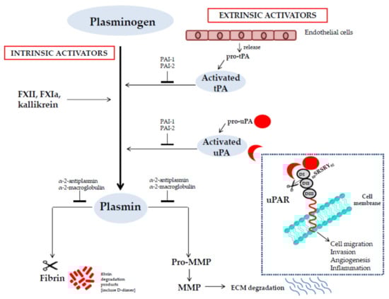The zymogen plasminogen is converted to the active protease plasmin by intrinsic and extrinsic activators. Intrinsic activators are members of the intrinsic coagulation pathway consisting of FXII, FXI, and kallikrein. Extrinsic activators are the tissue-type plasminogen activator (tPA) and the urokinase-type plasminogen activator (uPA). The tPA is released by endothelial cells as pro-tPA, a single-chain zymogen, and is converted into its two-chain active form by proteolytic cleavage. The uPA is synthesized as a single-chain zymogen (pro-uPA). Single-chain uPA is activated when it is converted to two-chain by plasmin (or other proteases) or when it binds as a single-chain molecule to its cellular receptor (uPAR). The uPA/uPAR interaction amplifies its capacity to activate plasminogen and also enhances a cascade of events triggering cell migration, invasion, angiogenesis, and inflammation. Inhibition of the plasminogen system may occur at the level of the plasminogen activators by plasminogen activator inhibitors (PAI-1 and PAI-2) or at the level of plasmin by α2-antiplasmin. The active plasmin degrades fibrin into soluble peptides eliminating its excess from blood and tissues. Plasmin is also able to activate matrix metalloprotease (MMP) zymogens, which play a key role in the degradation of the extracellular matrix (ECM).