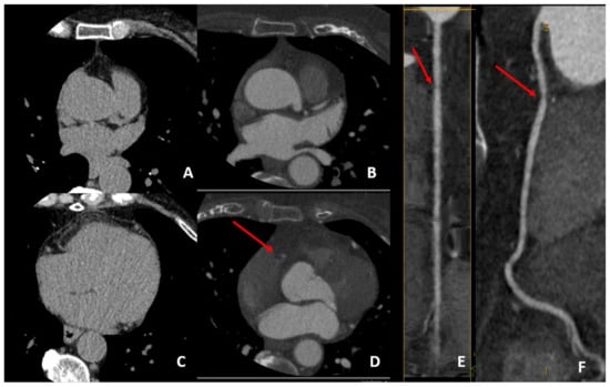 A case example of a middle-aged man with a family history of coronary artery disease (CAD) and noncardiac chest pain who was found to have a CACS value of 0 (panels (A,B)), but with identification at CCTA of fibro-lipidic plaque on proximal RCA (panels (C,D) in axial view). This high risk (positive remodeling and low-attenuation plaque) causes a moderate stenosis (50% to 70% stenosis) that is well evidenced at curved analysis (red arrow on panels (E,F)). This may merit aggressive cardiovascular risk factor control with preventive therapy in order to reduce the future risk of cardiovascular events that may be underestimated by CACS alone.