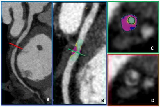 Postprocessing tools recently implemented have resulted in the accurate quantification of coronary artery luminal area, atherosclerotic plaque area, and plaque volume when compared with measurement by IVUS []; both low-attenuation plaque (cutoff < 30 HU) and fibro-fatty plaque (cutoff < 130 HU) volumes have been suggested to represent higher-risk atherosclerosis subtypes. It must be underlined that beyond promising results [], high heart rate, high heart rate variability, and elevated BMI that traditionally may affect the image quality of cardiac CT will reduce the feasibility and accuracy of advanced plaque analysis. Moreover, interscan reproducibility of plaque subtype quantification may be limited by different scan parameters (Kvp and mA) and different coronary lumen contrast attenuation as previously reported [].