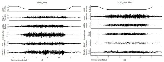 Raw surface electromyography (sEMG) recordings of the five muscles (indicated on the left) simultaneously displaying the abduction movement (from 0° to 45°). These have been obtained from one representative participant from the Older Adults group and one from the Adults groups, displaying the abduction movement.