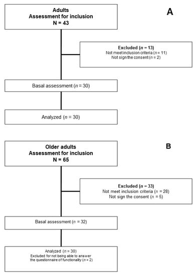 Flow of participants. (A) Adults; (B) Older adults.