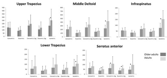 In general, the RMS values showed a decrease in older subjects (Older adults) with respect to adults in all muscles analyzed in terms of the three types of contraction (concentric, eccentric, and isometric) with and without added weight. However, no statistically significant differences were found in dynamic contractions regardless of load (Figure 3). Statistically significant differences were only found for isometric contraction (p < 0.05). In addition, the SA muscle showed statistically significant differences in terms of eccentric contractions with or without weight and concentric with weight (p < 0.05, Adults > Older adults).