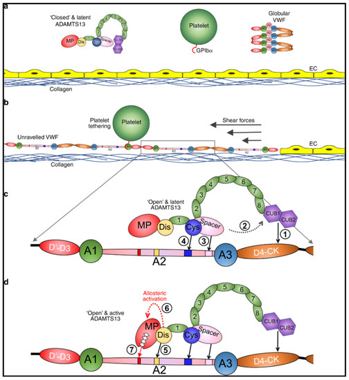 Mode of action of ADAMTS13. (a) Under normal circumstances, multimeric von Willebrand factor (VWF) circulates in the plasma in a globular conformation, in which its A1 domains are concealed, and so does not interact with platelets. ADAMTS13 circulates in a “closed” conformation stabilized through the interaction of the C-terminal CUB domains with the central Spacer domain. The MP domain of ADAMTS13 also has a latent conformation in which the active site cleft is occluded by the Ca2+-binding loop. This prevents ADAMTS13 from proteolyzing off-target substrates and confers resistance to plasma inhibitors. (b) Following vessel damage, the endothelium (EC) is disrupted to reveal subendothelial collagen. Globular VWF binds to this surface via its A3 domain and unravels into an elongated conformation in response to the shear forces exerted by the flowing blood. This reveals the A1 domain that can then capture platelets via the GPIbα receptor on the platelet surface. Unravelling of VWF also unravels the VWF A2 domain into a linear polypeptide conformation that reveals the binding sites for ADAMTS13 and the Tyr1605-Met1606 cleavage site, making it susceptible to proteolysis by ADAMTS13. (c) ADAMTS13 recognizes unfolded VWF through multiple interactions. (1) The CUB domains bind the VWF D4-CK domains, which (2) induces their dissociation from the Spacer domain. (3) The Spacer and (4) cysteine (Cys)-rich domain exosites recognize the C-terminal region of the unfolded A2 domain to bring the enzyme and substrate into proximity. (d) Once bound, (5) the disintegrin-like (Dis) domain exosite engages VWF residues Asp1614–Asp1622. This interaction (6) induces an allosteric change in the MP domain. This causes a conformational change, disrupting the “gatekeepertriad” that otherwise occludes the active site cleft, to reveal the S1′ pocket. Once allosterically activated, (7) the MP domain proteolyzes the scissile bond. Petri et al. [54], pp. 1–16. The corresponding author, James Crawley agreed to use of the Figure. No changes were made to the original figure. Creative Commons License: http://creativecommons.org/liceses/by/4.0/.