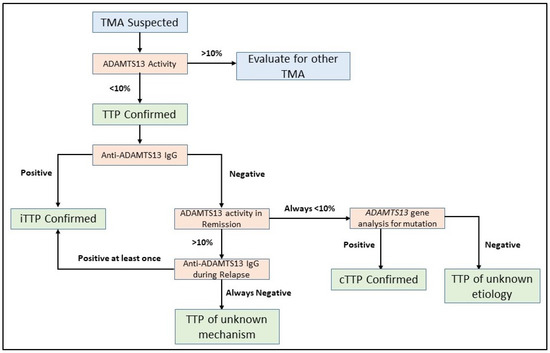 Assaying the ADAMTS13 activity is the first test which should be undertaken in patients with a suspected TMA. Severe ADAMTS13 deficiency, which is defined by an activity level <10%, is required to confirm the diagnosis of TTP (Figure 2) [119]. ADAMTS13 activity assays are based on degradation of either full-length VWF or synthetic peptides of VWF by ADAMTS13 in the plasma sample being tested. VWF cleavage products are detected by fluorescence resonance energy transfer (FRETS), enzyme-linked immunosorbent assays (ELISAs), surface-enhanced laser desorption/ionization time-of-flight (SELDI-TOF)-mass spectrometry, electrophoresis, reduced collagen binding, or reduced ristocetin-induced platelet agglutination [11,12,126,127,128,129,130,131,132,133]. Though multiple assays have been developed, the FRETS-VWF73-based assay [128,134] is most commonly used in clinical settings [135] and is considered as the reference method for ADAMTS13 activity, typically calibrated against the World Health Organization International Standard ADAMTS13 plasma (normal 100%) [136]. However, ADAMTS13 activity testing is labor intensive, time consuming, and limited to reference laboratories typically. Though the FRETS assay can be completed quickly, the turnaround time for results can be three to six days as it is typically performed only in reference centers. Given the variability in ADAMTS13 testing turnaround time for any individual center, point-based scoring systems which predict the probability of severely deficient ADAMTS13 have been developed to avoid delays in prompt treatment initiation [122,137,138]. Importantly, these scores are not meant to replace ADAMTS13 testing but to aid decision making until test results are available. Recently, fully automated chemiluminescence immunoassays have been developed with drastically reduced analytical times of approximately 30 min [139,140]. In addition, a semiquantitative ADAMTS13 activity assay has also been developed which provides an easily interpreted four-level indicator of ADAMTS13 activity, allowing identification of activity levels < 10% [141]. A potential advantage of such an assay is rapid screening for severely deficient ADAMTS13 activity which can be utilized at non-specialized centers to facilitate referral to tertiary centers for additional testing and management.