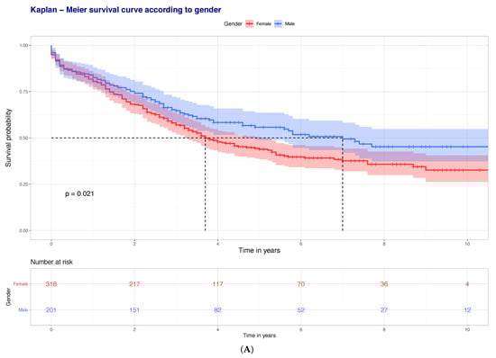 Regardless of age, 30-day mortality was 5.4%, compared to 17.3% for one-year mortality. In patients older than 65 years old (391 patients), 30-day mortality increased to 7.6% and one-year mortality to 25.6%. One-year mortality (regardless of age) was higher in female patients even though this was not statistically significant (p = 0.575), but it was significantly higher with an increasing age (p < 0.001). Kaplan–Meier survival curves for overall mortality on the other hand demonstrated a statistically significant higher mortality risk associated with female gender and age (p < 0.001 and p = 0.021 respectively) (Figure 1). Average time to death from injury was 25.7 months (median: 21.4 months; SD: 23.1 months). Thirty-day mortality was positively correlated with age, with no patient younger than the age of 65 years dying within 30 days and no patient younger than the age of 40 years dying within the first-year post injury. The comparison of the different parameters according to one-year mortality is presented in Appendix A, whilst the significant unadjusted associations are presented in Table 1. Interestingly, within our cohort timing of operative intervention (i.e., operation within 48 h from admission) had no impact on mortality (p = 0.871).