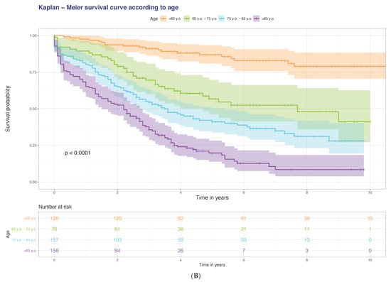 Kaplan–Meier survival curves (one-year mortality) according to (A) gender and (B) age of patients.