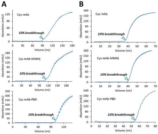 Membrane dynamic binding capacity at 10% breakthrough. (A) Sartobind® S, 3 mL, 8 mm bed height with mAb, mAb-MMAE, and mAb-PBD conjugates. (B) Sartobind® Phenyl, 3 mL, with mAb, mAb-MMAE, and mAb-PBD conjugates. Protein samples were diluted as 1.0 mg/mL with 20 mM MES, pH 6.0.