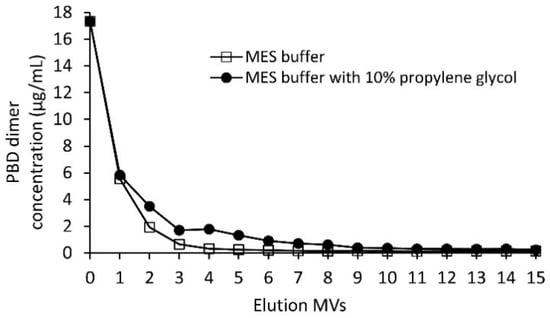The Sartobind® S clearance trend of the linker-PBD using 20 mM MES buffer at pH 6.0 with and without 10% propylene glycol. The linker-PBD concentration from each eluted MVs was quantified with the LC-MS/MS method as described in the Materials and Methods section.