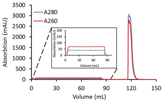 To test the scalability of the CEX purification using membrane adsorbers to remove free payload from the conjugation crude reaction mixture at gram-scale, 1.7 g of cys-mAb-PBD in reaction buffer was diluted with CEX equilibration buffer (20 mM MES buffer, pH 6.0) to a concentration of 1 g/L and then loaded onto a 75 mL Sartobind® S CEX membrane adsorber equilibrated with CEX binding buffer (20 mM MES buffer, pH 6.0). The membrane was washed with 10 MVs of CEX equilibration buffer, and conjugates were then eluted from the membrane with CEX elution buffer at a flow rate of 1 mV/min. Figure 5 shows the UV chromatogram from the scale-up run. The purified conjugate (eluate fraction) was analyzed by HIC, SEC, and LC-MS/MS. The HPLC chromatograms show that the payload was efficiently removed, and the process was scalable at 1.7 g of protein with the process being completed within 30 min. Residual free payload was measured using an LC-MS/MS assay (described in the Materials and Methods section). The residual payload amount was reduced from 88.8 µg/mL in the crude reaction mixture, to 63.81 ng/mL after washing with 10 MVs of CEX binding buffer, which is over 3 logs reduction of free linker-PBD.