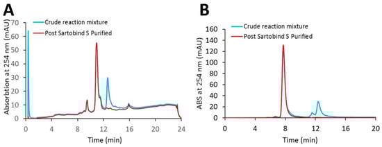 HPLC analytical characterization of the cys-mAb-PBD crude reaction mixture and the Sartobind® S membrane purified conjugate. (A) HIC analysis. (B) SEC analysis. The blue line indicates the crude reaction mixture; the red line indicates the purified conjugate.