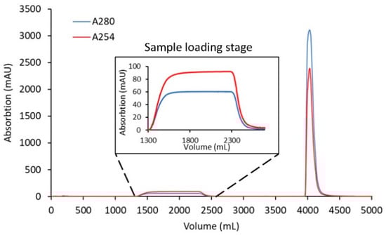 The amount of sample loaded to the membrane was calculated according to the following equation: where C0 is the protein concentration in the sample (mg/mL), VL is accumulated volume per fraction (mL), V0 is system void volume (mL), and Vc is the membrane volume (mL).