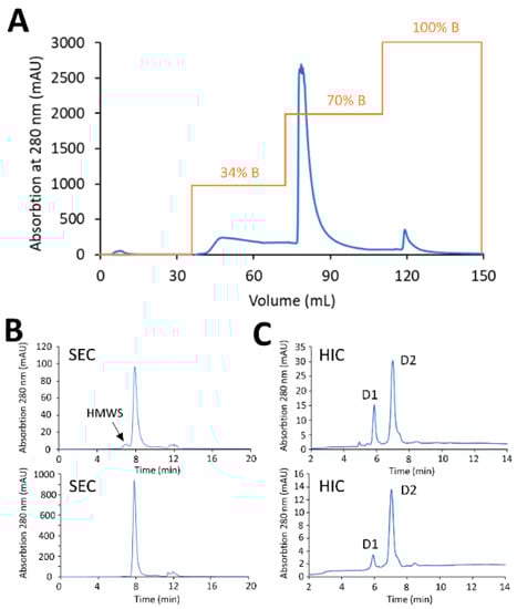 - Matsuda, Y.; Leung, M.; Okuzumi, T.; Mendelsohn, B. A Purification Strategy Utilizing Hydrophobic Interaction Chromatography to Obtain Homogeneous Species from a Site-Specific Antibody Drug Conjugate Produced by AJICAP™ First Generation. Antibodies 2020, 9, 16. [Google Scholar] [CrossRef] [PubMed]