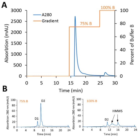 Small-scale screening experiments were used to test the ability to remove protein-based impurities using preparative HIC membrane adsorbers. To determine the resolving power of phenyl membrane adsorber to remove under-conjugated species, a crude reaction mixture of PBD conjugates was generated to purposely have a high percentage of low-DAR species (antibody with zero drug, D0 and antibody with one drug, D1) representing a worst-case scenario. A total of 20 mg of crude PBD conjugate with a DAR of 1.68 and 4.9% HMWS (see the Materials and Methods section) were diluted 4-fold in HIC binding buffer and loaded at 1 MV/min onto a Sartobind® Phenyl membrane (3 mL) equilibrated with HIC binding buffer. After sample loading, the membrane was washed with 3 MVs of equilibration buffer, prior a multi-step elution phase into HIC elution buffer (25 mM sodium phosphate, pH 7.0, with 20% (v/v) isopropyl alcohol (IPA)). Elution of the low-DAR species was carried out using an initial step-gradient to 34% elution buffer for 10 MVs, after which a second step-gradient to 70% elution buffer for 10 MVs was used to elute the target DAR 2 conjugate, and finally a step -gradient to 100% elution buffer for 10 MVs was used to strip off HMWS impurities, including higher-DAR and aggregates (Figure 6A). Analysis by analytical HIC of the purified conjugates from the target fraction (eluates at 70% elution buffer) displayed a final DAR of 1.92, denoting significant purification of the desired DAR 2 species. In addition, the HMWS decreased from 4.9% to less than 1% when analyzed by SEC (Figure 6B,C).