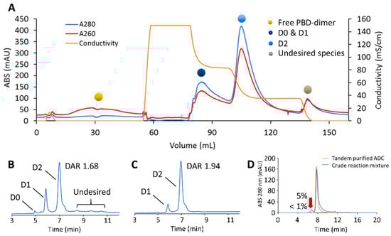 Tandem-model purification of the crude mAb-PBD dimer conjugate. (A) Purification of engineered Cysteine-mAb-PBD ADC in the tandem model. The quenched reaction mixture was loaded to Sartobind® S that was tandemly connected to Sartobind® Phenyl. The conjugation species were separated through loading, washing, and multiple elution steps. (B) HIC profile showing that the crude reaction mixture contains ADC variants with a range of DAR, residual linker-PBD, aggregates, and organic solvent. (C) HIC profile of the tandem method-purified ADC. The DAR of the ADC increased from 1.68 to 1.94. (D) SEC profile showing the percentage of aggregate dropped from 5% to less than 1% after tandem-model purification.