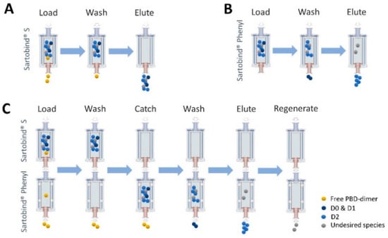Process-diagram overview. (A) Bind/Elute using Sartobind® S to remove residual payload. (B) Bind/Elute using Sartobind® Phenyl to remove aggregate in stand-alone model. (C) Simplified process to purify target ADC with Sartobind S and Phenyl in tandem model.