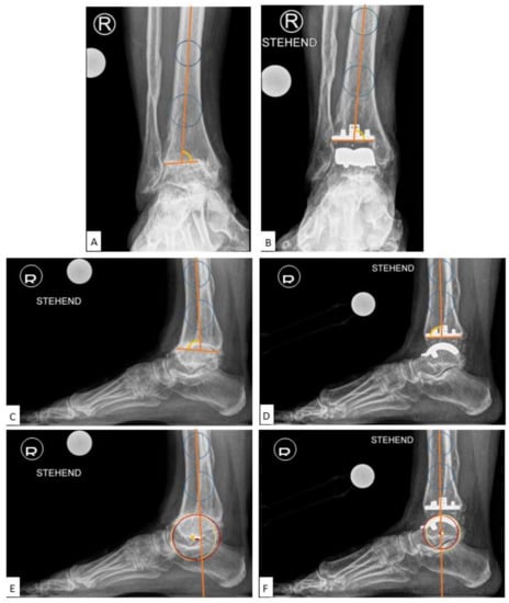 - Veljkovic, A.; Norton, A.; Salat, P.; Abbas, K.Z.; Saltzman, C.; Femino, J.; Phisitkul, P.; Amendola, A. Sagittal Distal Tibial Articular Angle and the Relationship to Talar Subluxation in Total Ankle Arthroplasty. Foot Ankle Int. 2016, 37, 929–937. [Google Scholar] [CrossRef]