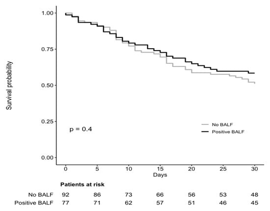 The 30-day case-fatality of VAP was 46% (78/171). Table 2 and Table 3 show the results of univariable and multivariable analyses, respectively, of factors associated with 30-day fatality. In univariable analysis, higher SOFA score, septic shock at VAP onset, ARDS at VAP onset, AKI at VAP onset, hemodialytic therapy at VAP onset, and ECMO at VAP onset were unfavorably associated with the outcome, whereas previous treatment with anti-IL-6 receptor monoclonal antibodies and tracheostomy before VAP were associated with reduced 30-day case fatality. In multivariable analysis (model A), only septic shock at VAP onset (odds ratio (OR) 3.30, 95% CI 1.43–7.61, p = 0.005), and ARDS at VAP onset (OR 13.21, 95% CI 3.05–57.26, p < 0.001) retained an independent association with the outcome. As shown in Table 3, the results of the additional multivariable model with center as a random effect (model B) were in line with those of model A. The 30-day case-fatality of BALF culture-positive VAP was 42% (32/77). Results of univariable and multivariable analyses of factors associated with 30-day case-fatality in this subgroup are reported in detail in Supplementary Materials Tables S4 and S5. In the multivariable model, ARDS at VAP onset showed an independent association with 30-day case-fatality (Table S5). Similar Kaplan–Meier curves were observed for 30-day case fatality in patients who did not undergo bronchoscopy vs. patients with positive BALF cultures (Figure 1).