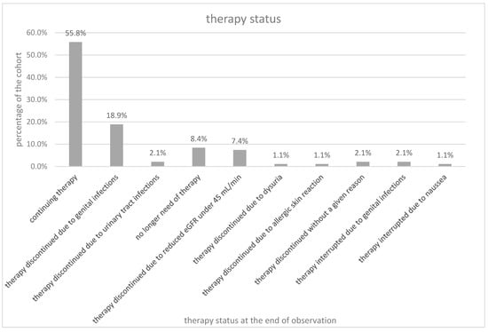 42 patients (44.2%) discontinued the treatment with SGLT2 inhibitors. The dropouts occurred after a mean observation time of 1.0 ± 0.7 years. Twenty patients (21.1%) discontinued due to genital infections (18 patients—18.9%) or urinary tract infections (2 patients—2.1%). Eight patients (8.4%) no longer needed the therapy because glycemic control allowed to discontinue the medication. Seven patients (7.4%) had a reduced eGFR under 45 mL/min. One patient (1.1%) each discontinued due to dysuria or allergic skin reaction. Two patients (2.1%) quit the treatment without a given reason. Two patients (2.1%) interrupted the therapy due to genital infection and one patient (1.1%) due to nausea but continued the therapy later. The distribution of the mentioned reasons to discontinue therapy are shown in Figure 1. All seven patients who discontinued the treatment because of reduced eGFR under 45 mL/min took either ACE-inhibitors/ARBs (6 participants) or diuretics (1 participant).