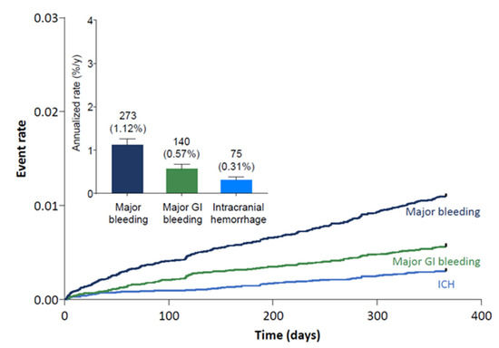 In the Global ETNA-AF population, bleeding event rates were low at the 1-year follow-up. Annualized event rates were 1.12% for major bleeding, 0.31% for intracranial hemorrhage, and 0.57% for major GI bleeding (Figure 1).