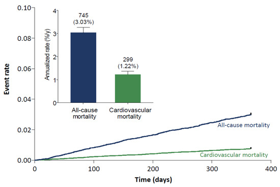 Results are presented by summary statistics (n, mean, standard deviation; or median, lower quartile, and upper quartile) for numerical parameters and absolute and relative frequencies for categorical variables. Baseline data are presented as frequencies and/or as summary statistics. The number of patients with at least one clinical event is presented separately for each type of clinical event and the time-to-event data are presented as annualized rates (cases per 100 patient-years and displayed as %/year). Cumulative incidence functions were computed as 1-S(t), where S(t) is the Kaplan–Meier estimate of the survival function.