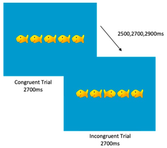 Eriksen Flanker Task: A modified version of the Eriksen flanker task was used to assess attentional inhibition []. Various versions of the flanker task have proven to be reliable and valid tools to use in preschool-aged children [], and have been previously employed in children as young as 4 years as well as school-aged children []. The flanker task requires children to respond to a centrally presented target stimulus amid an array of 4 flanking stimuli. In the version of the task used in the current study, both the target and flanking stimuli were left- or right-oriented fish, illustrated in Figure 2. The task consisted of congruent trials, in which flanking fish were facing the same direction as the target fish, and incongruent trials, in which flanking fish were facing the opposite direction of the target fish. Participants were given a practice block, where they had to get at least a 70% overall accuracy, to ensure they understood instructions. Successful performance on the incongruent trials, relative to congruent trials, requires cognitive control to selectively attend and respond to the directionality of the target stimulus while suppressing interferences elicited by the flanking stimuli. Congruent and incongruent trials were presented in random order with equal probability based on the congruency and directionality of the target stimulus. Participants completed one block of 50 trials. Stimulus presentation time was 2700 ms with a jittered ITI of 2500, 2700, or 2900 ms. Outcome measures for this task included accuracy and reaction time for the congruent and incongruent trials.