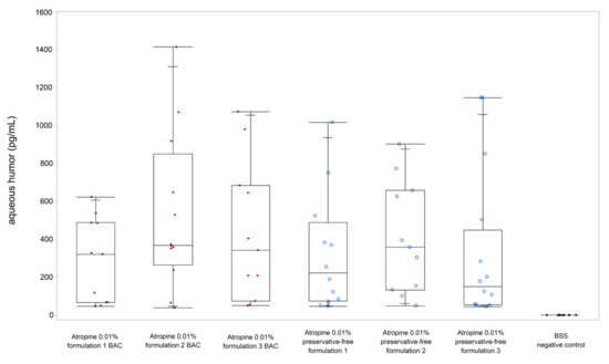 Concentration of atropine sulphate in aqueous humor for atropine 0.01% formulation with BAC (red) vs. preservative-free formulations. The bars within the box plots represent the median values, the edges represent the 25th/75th percentiles, and the whiskers extend from the ends of the boxes to the outermost data points within the quartile—1.5× of the interquartile range.