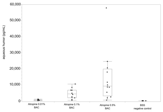 Concentration of atropine sulphate in aqueous humor for different atropine concentrations (0.01%, 0.1%, 0.5%, all including BAC). The bars within the box plots represent the medians, the edges represent the 25th/75th percentiles, and the whiskers extend from the ends of the box to the outermost data points within the quartile—1.5× of the interquartile range.