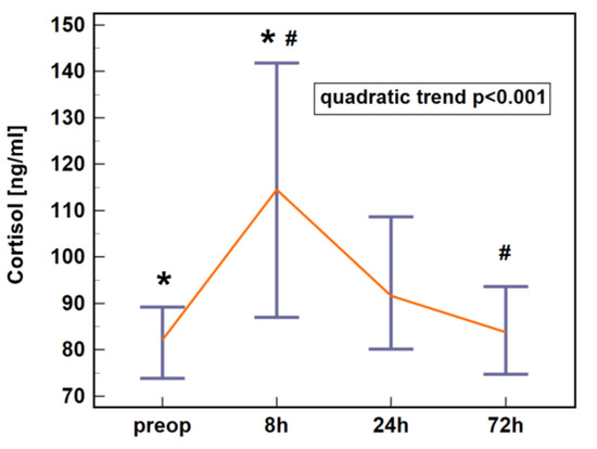 Cortisol concentration in early postoperative period following colorectal surgery displayed a quadratic trend. It increased at 8 h post-incision and dropped at 24 and 72 h (Figure 1).