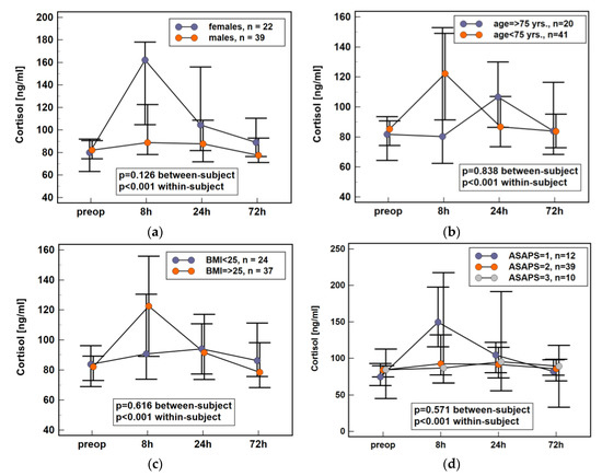 Impact of various patient characteristics on plasma cortisol dynamics in early postoperative period following colorectal surgery: (a) sex; (b) age; (c) body mass; (d) health status. Data presented as medians with 95% CI. Data were analyzed following log-transformation using repeated measures analysis of variance with p values indicating significance of between-subjects (sex, age, body mass, and ASAPS) and within-subjects (time points) effects (n = 61). BMI, body mass index; yrs., years; ASAPS, the American Society of Anesthesiologists physical status classification system; CI, confidence interval; preop, preoperative; 8 h, 8 h post-incision; 24 h, 24 h post-incision; 72 h, 72 h post-incision.