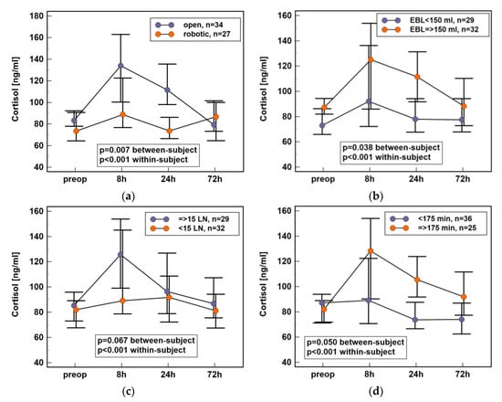 Surgery-related factors such as surgery type (open vs. robotic), number of harvested lymph nodes (using ≥15 as a cut-off), estimated blood loss (EBL) (using ≥150 mL as a cut-off), and length of surgery (using ≥175 min as a cut-off) were analyzed. Dynamics of cortisol concentration in early postoperative period differed significantly between patients undergoing open and robot-assisted colorectal surgery (Figure 3a), between patients with non-substantial and substantial blood loss (Figure 3b), and with respect to surgery length (Figure 3c). It also tended to differ with respect to the extent of the procedure, which was expressed by the number of harvested lymph nodes, with cortisol levels appearing lower in patients with less than 15 lymph nodes excised (Figure 3d). Individual cortisol concentrations are provided in Supplementary Materials Table S4.
