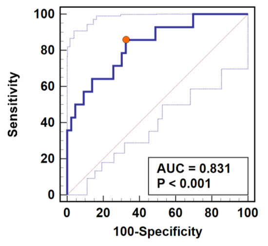 We compared the power of cortisol and C-reactive protein (CRP) to predict SSI prior to their clinical manifestation. Cortisol was evaluated as a change at 24 h or 72 h in relation to baseline concentration (Δ24 h/0 or Δ72 h/0 ratios) or as absolute values measured at 24 or 72 h. Cortisol concentration adjusted to baseline was superior to absolute hormone concentration at 24 or 72 h. Change in cortisol at 24 h (Δ24 h/0 ratio) and CRP concentration at 72 h were superior individual predictors of SSI. Cortisol as SSI biomarker was characterized by high sensitivity but low specificity, while CRP at 72 h was characterized by low sensitivity but high specificity (Table 3). Combined evaluation of both—cortisol Δ24 h/0 and CRP at 72 h—had improved overall accuracy (83%) and high sensitivity (86%) accompanied by moderate specificity (67%) (Table 3, Figure 4).
