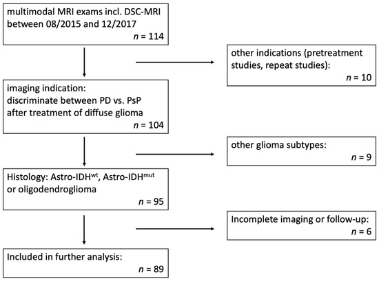 Patients were recruited from the hospital’s imaging database in a retrospective manner; the hospital’s local review board approved the retrospective study design and waived written informed consent. All patients who received a multimodal MRI with DSC-MRI on one scanner in our institution between 08/2015 and 12/2017 were reviewed. 104 patients with the imaging indication to discriminate between PD vs. PsP after treatment were included. Subsequently, patients with previously defined histopathological diagnosis (conform to the 2016 CNS WHO criteria [17]) were reviewed and only those with astrocytic tumors (IDH wild type (Astro-IDHwt) or IDH mutated (Astro-IDHmut)) and oligodendrogliomas (IDH-mutant, ATRX-wildtype, and 1p/19q-codeletion) were included (n = 95). Finally, patients with incomplete imaging or missed follow-up were excluded, leading to a final patient number of 89 (Figure 1).