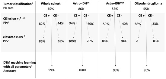Multilevel classification for the differentiation of progressive disease vs. pseudoprogression: 1 The rate of progressive disease depends on the tumor type. 2 The positive predictive value for progressive disease is higher in the presence of a contrast-enhancing lesion in each tumor type, but not equally so. 3 Additional information about an elevated rCBV parameter (mean or max, above a cut-off value shown in Table 3) amends the positive predictive value especially in lesions without contrast enhancement. 4 The machine learning-based decision tree analysis including 2 × 9 parameters (see Methods) elevates prediction accuracy to 93% and above. 5 In this group, 7/8 patients had progressive disease, therefore further analysis was waived. Abbreviations: rCBV: regional cerebral blood volume; Astro-IDHwt: isocitrate dehydrogenase wild type astrocytic tumor; Astro-IDHmut: astrocytic tumor with isocitrate dehydrogenase mutation; PD: progressive disease; PsP: pseudoprogression; CE: contrast-enhancing; DTM: decision tree-based model.