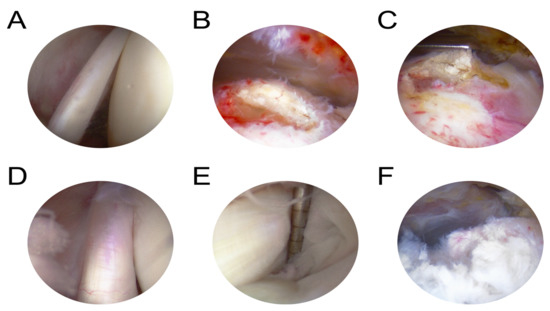 Arthroscopic slides obtained during the shoulder arthroscopy presenting biceps tendon pathology with abundant vascularization in (A,D); partial rotator cuff tears, articular side in (E) and bursal side in (F); and also, complete rotator cuff tears in (B,C).