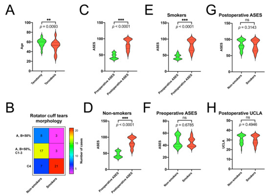 Summarized statistical analysis depending on age, the smoking status, rotator cuff tears morphology, pre/postoperative ASES and postoperative UCLA. (A) Comparison of age in tenotomy/tenodesis groups. (B) Heat map of distribution of RCTs morphology according to smoking status. (C) Comparison of preoperative ASES and postoperative ASES in general population. (D) Comparison of preoperative ASES and postoperative ASES in non-smoking population. (E) Comparison of preoperative ASES and postoperative ASES in smoking population. (F) Comparison of preoperative ASES in non-smoking and smoking population. (G) Comparison of postoperative ASES in non-smoking and smoking population. (H) Comparison of postoperative UCLA in non-smoking and smoking population; ns, p > 0.05; ** p > 0.0001; *** p < 0.0001.