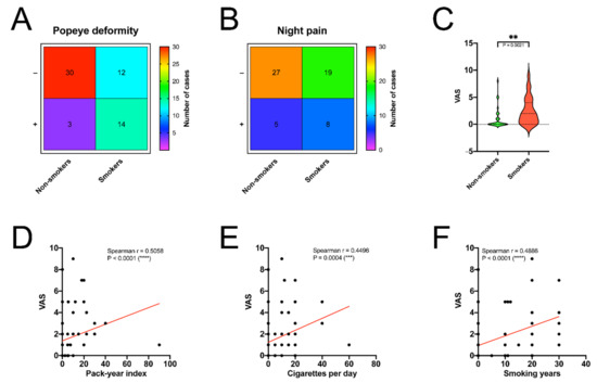 (A,B) Heat map of distribution of Popeye deformity and night pain according to smoking status; (C) Comparison of VAS in non-smoking and smoking population; (D,E,F) Correlation between the VAS and pack-years index, cigarettes per day, smoking years.