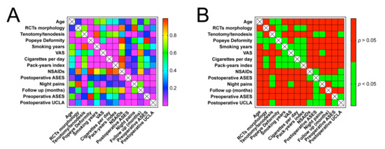 There was no correlation between pre/postoperative ASES, postoperative UCLA, and smoking indexes. However, there was a positive correlation between VAS and pack-year index (p < 0.0001), the number of cigarettes smoked per day (p = 0.0004), and smoking years (p < 0.0001) (Figure 3D–F). The correlation matrix using Spearman tests of all included variables was presented in Figure 4A,B, comparing the Spearman rho and p values, respectively.