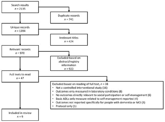 Of the 47 full texts that were read, only nine studies met all of our inclusion criteria [,,,,,,,,]. Sixteen records were excluded because they were determined not to be reporting results from controlled interventional studies [,,,,,,,,,,,,,,,]. Eight records were excluded because outcomes of the intervention were only measured in a laboratory environment [,,,,,,,]. Six records were excluded because they did not report any outcomes that were directly related to social participation or self-management [,,,,,]. Four records reported on BADLs only [,,,]. Three studies were excluded because although participants with some form of cognitive impairment were included in the study, the outcomes were not reported separately from outcomes from those who were either cognitively healthy or had other pathologies [,,]. One record was excluded because it was discovered to be a protocol only, not reporting any results [].