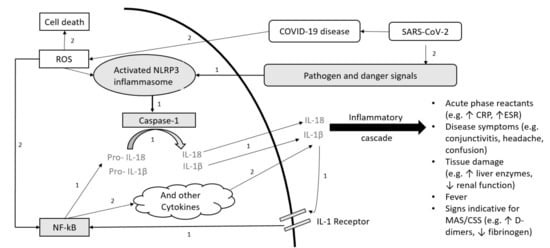 Schematic overview of the pathogenesis for IL-1-mediated autoimmune disease (AID) and COVID-19. (1.) Pathogenesis of NLRP3 Inflammasome associated AID (gray): Inflammasome formation is induced by a variety of triggers. Activated NLRP3 subsequently drives caspase-1 activation. Caspase-1 mediates transformation from pro-IL-1β and pro-IL-18 to active IL-1β and IL-18. The positive feedback loop stimulates NF-kB. (2.) SARS-CoV-2 pathogenesis (white): SARS-CoV-2 can stimulate a hyperinflammatory immune response with epithelial cell-mediated production of reactive oxygen species (ROS). ROS can stimulate NF-kB and NLRP3. Both pathways (1. and 2.) result in increased cytokine levels with laboratory signs and clinical symptoms associated with hypercytokinemia. Abbreviations: SARS-CoV-2: severe acute respiratory syndrome coronavirus 2; COVID-19: coronavirus disease 2019; ROS: reactive oxygen species; NLRP3: (NOD)-like receptor protein 3; NF-kB: nuclear factor kappa B; IL: interleukin; CRP: C-reactive protein, ESR: Erythrocyte sedimentation rate, MAS: macrophage activation syndrome; CSS: cytokine storm syndrome.