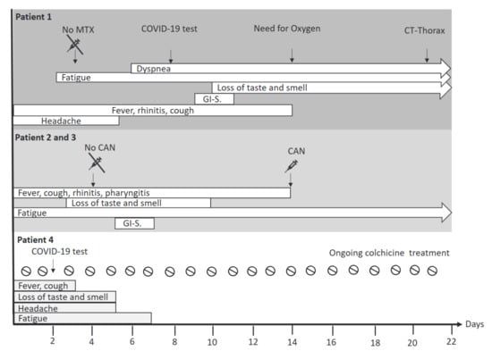 Patient 4 developed fever, cough, loss of taste and smell, and headache four days after her last canakinumab injection (Figure 2). Cessation of cough and fever was reported two to three days after symptom onset. Disappearance of headache and normalized smell and taste was reported 5 days after the onset of COVID-19 symptoms. Fatigue was present until day 7. Recovery was reported since day 8. Canakinumab injections and also colchicine treatment were continued (Figure 2).